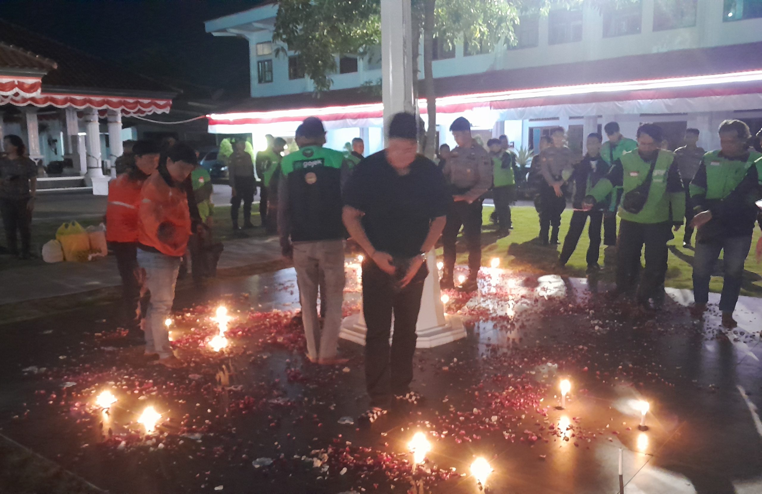 Pati – Sejumlah elemen masyarakat Pati menggelar aksi damai dengan doa bersama di halaman Pendopo Kabupaten Pati, Minggu (31/8/2025) malam. Hadir dalam kegiatan ini mahasiswa, aparat kepolisian, TNI, pengemudi ojek online (ojol), serta warga Pati. Anggota DPRD Pati, Danu Ikhsan, juga turut hadir.
